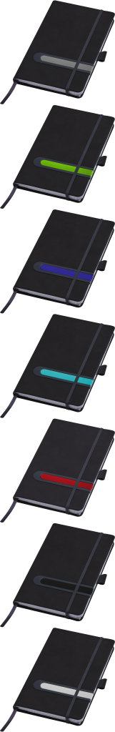 Notizbuch mit Hardcover aus PU-Material A5 210 x 130mm in schwarz oder weiß mit integriertem farbigem Notizschreiber (1.000m). Runde Ecken, 6mm Elastikverschlussband, Satin-Lesezeichen und Stifteschlaufe. Visitenkartenfach und Einstecktasche. 190 Notizseiten aus 80gr/m² weißem Papier 1/0- farbig bedruckt, alle Seiten druckgleich kariert.
