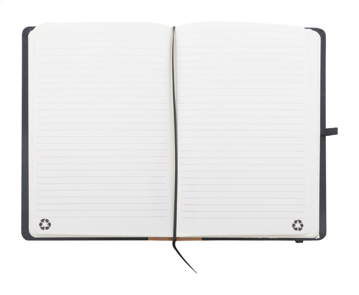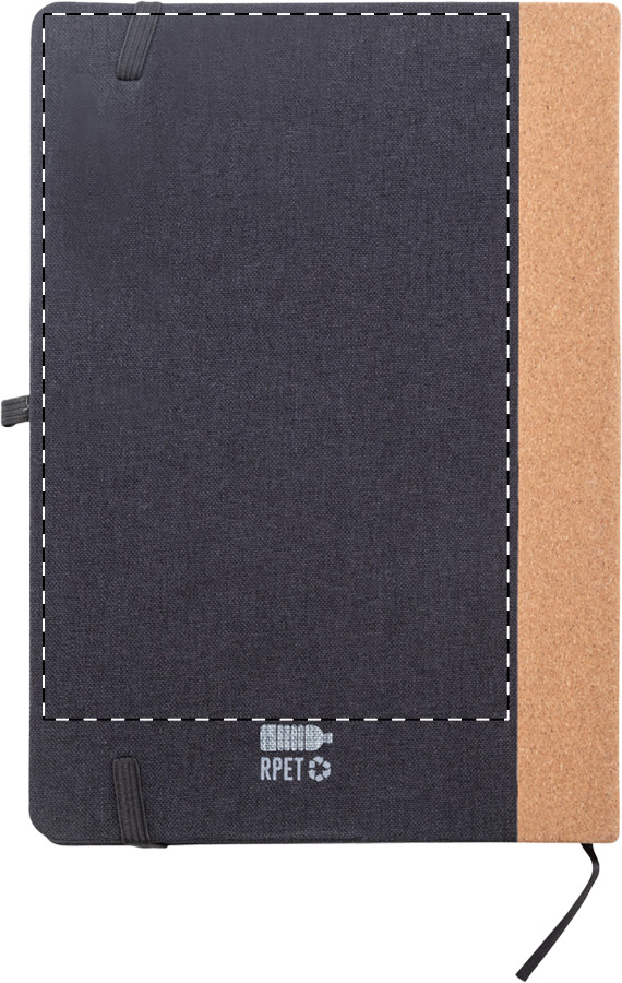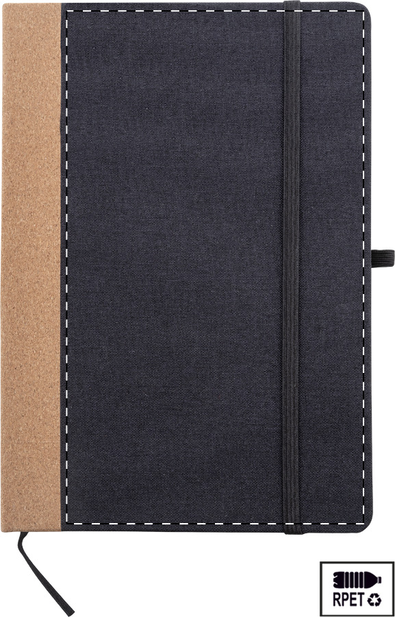 A5 Notizbuch mit RPET-Polyester-Einband, Naturkorkrücken und 80 linierten Seiten aus Recyclingpapier. Mit Lesezeichen, Gummiband und Stifthalter.