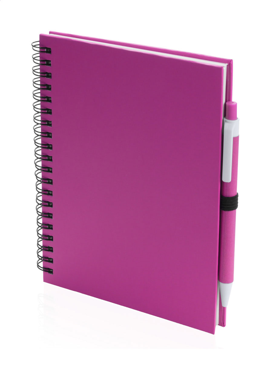 Notizbuch aus Karton, 70 Seiten (blanko), mit farblich abgestimmtem Kugelschreiber aus Recyclingpapier (blauschreibend).