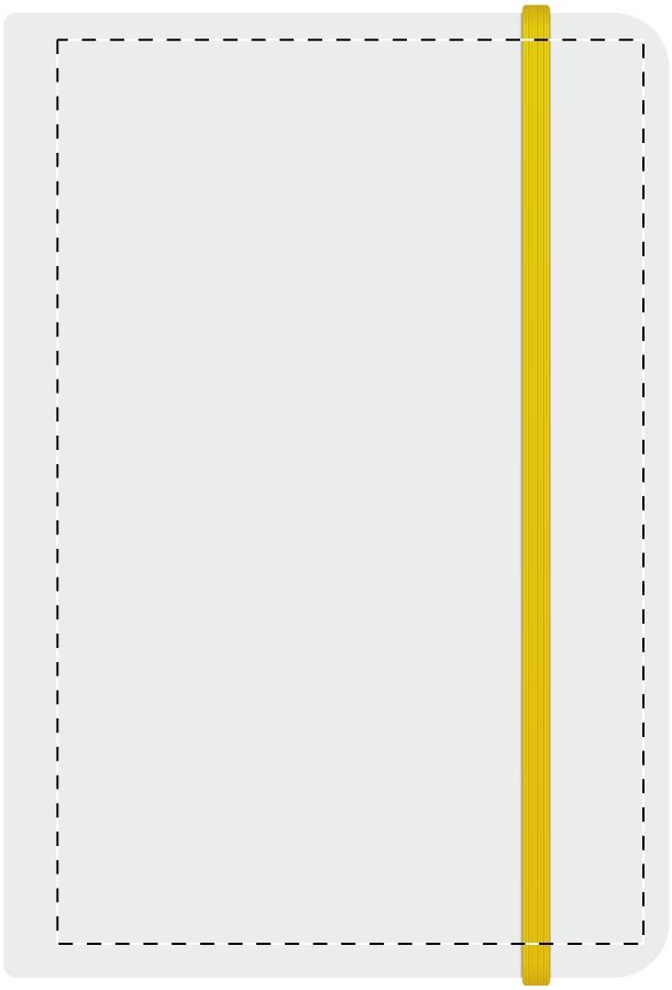 A5 Notizbuch, 100 Seiten (blanko), farbigem Gummiband und farblich abestimmten Blattrand.