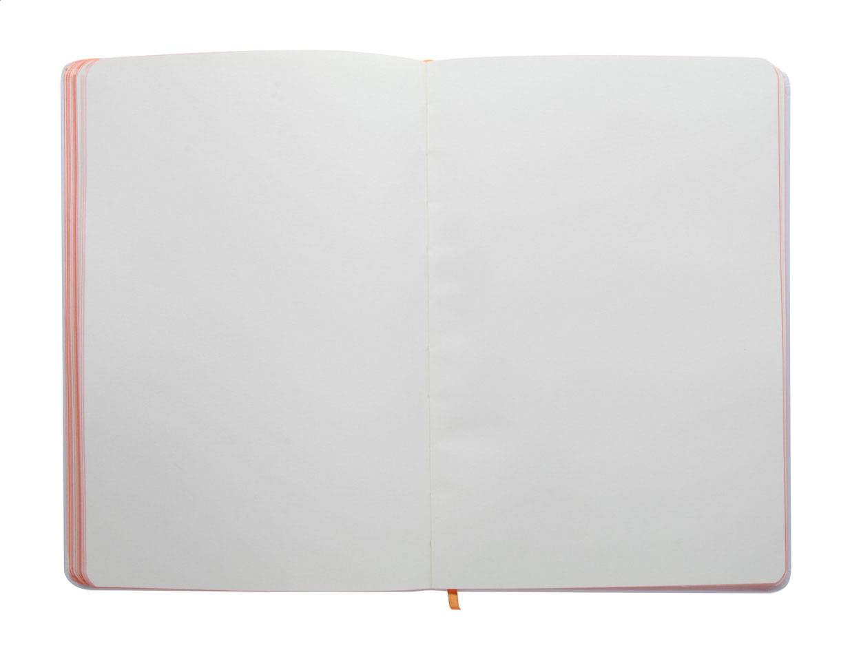 A5 Notizbuch, 100 Seiten (blanko), farbigem Gummiband und farblich abestimmten Blattrand.