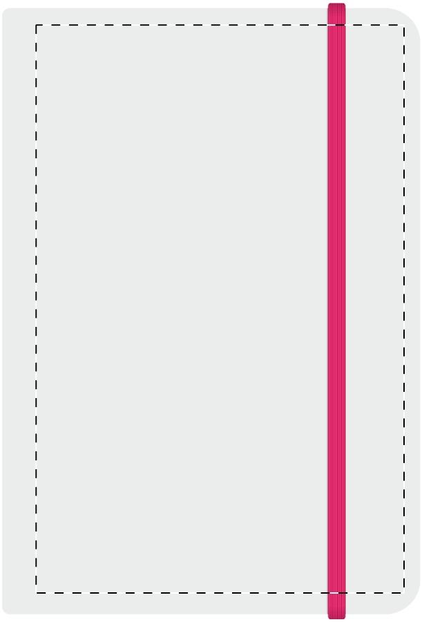 A5 Notizbuch, 100 Seiten (blanko), farbigem Gummiband und farblich abestimmten Blattrand.