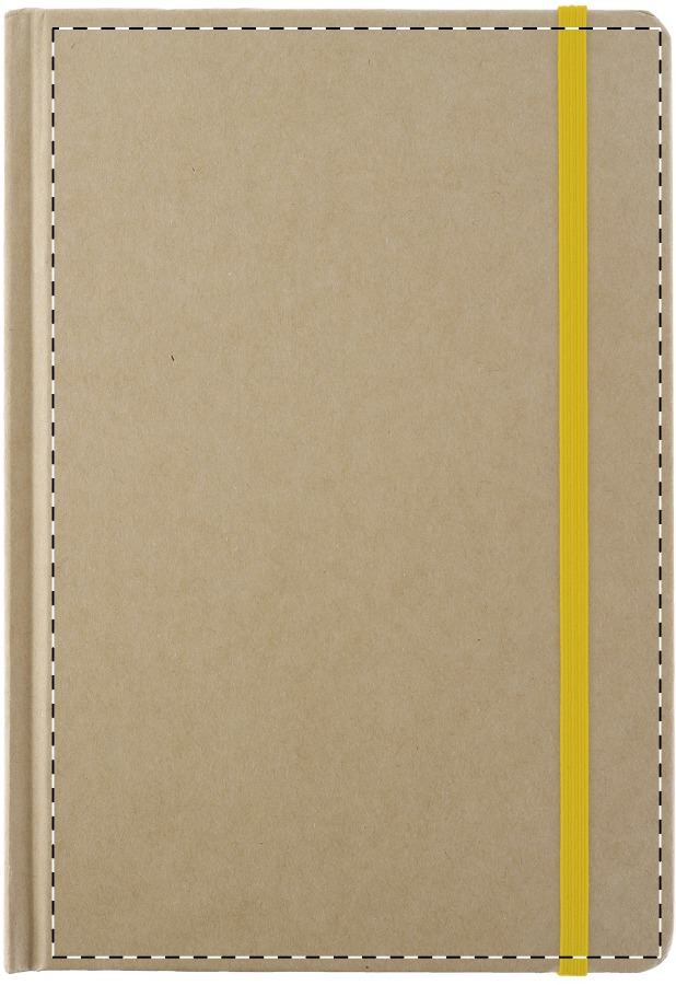 Notizbuch aus recyceltem Karton mit 100 Seiten (blanko), farbigem Lesezeichen und Gummiband.