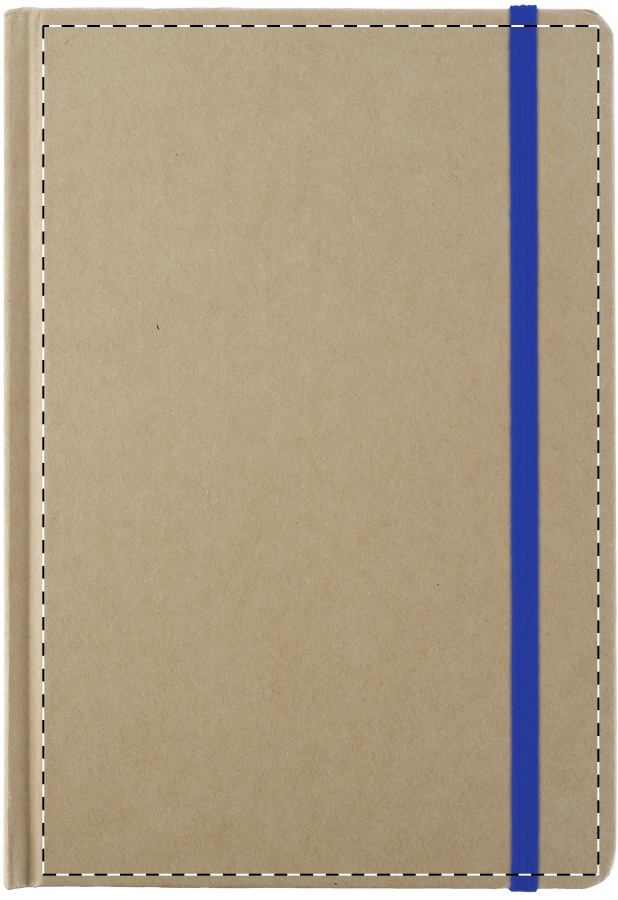 Notizbuch aus recyceltem Karton mit 100 Seiten (blanko), farbigem Lesezeichen und Gummiband.