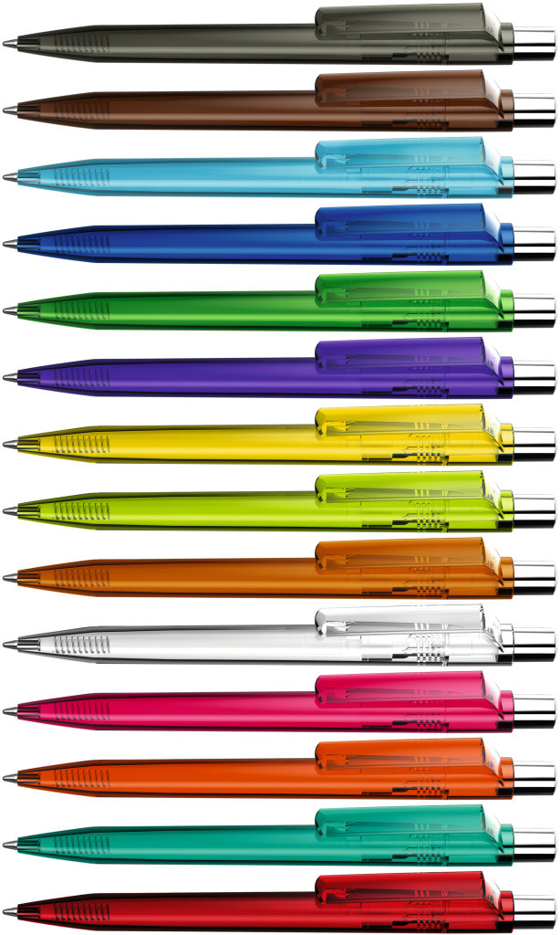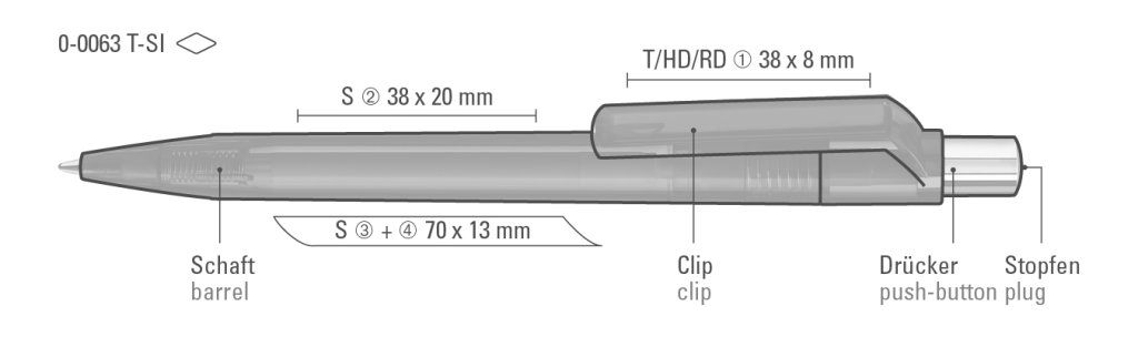 Druckkugelschreiber mit transparent glänzendem Gehäuse, silber glänzendem Drücker und farbigem Stopfen.Druckbereich: Auf dem Clip 38mm x 8mm Tampondruck (T), auf dem Clip 38mm x 8mm Digitaldruck (HD), auf dem Clip 38mm x 8mm Reliefdruck (HD), in Clipverlängerung 38mm x 20mm Siebdruck (S), gegenüber vom Clip 70mm x 13mm Siebdruck (S), seitlich vom Clip 70mm x 13mm Siebdruck (S)