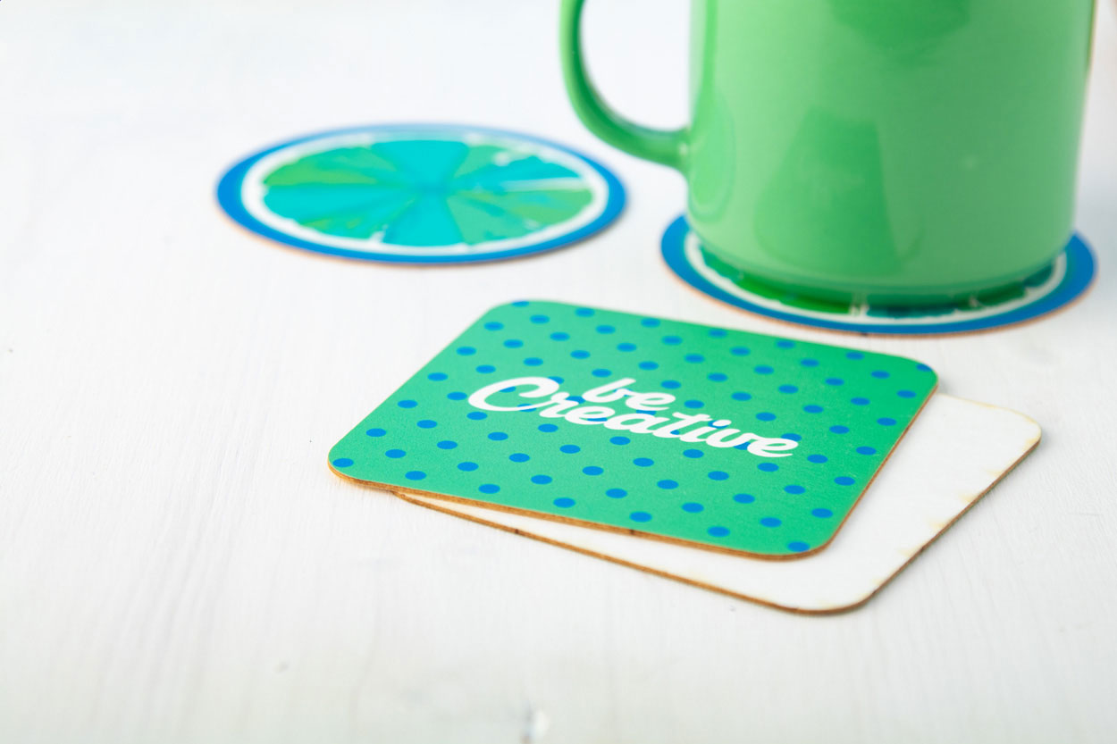 Individueller, saugfähiger Papier-Untersetzer mit individuellem Druckmotiv auf einer Seite. Mindestmenge: 250 Stk.