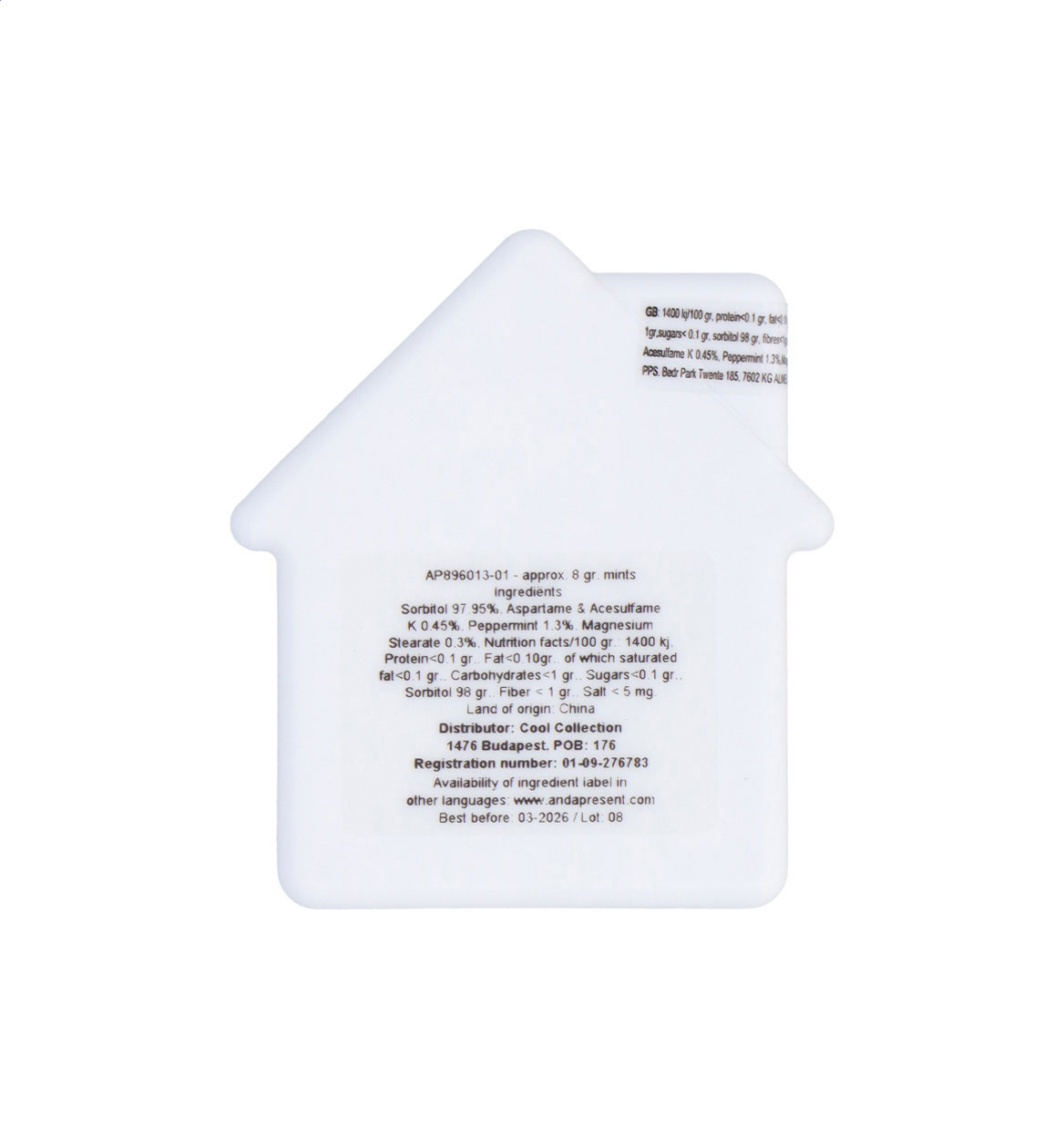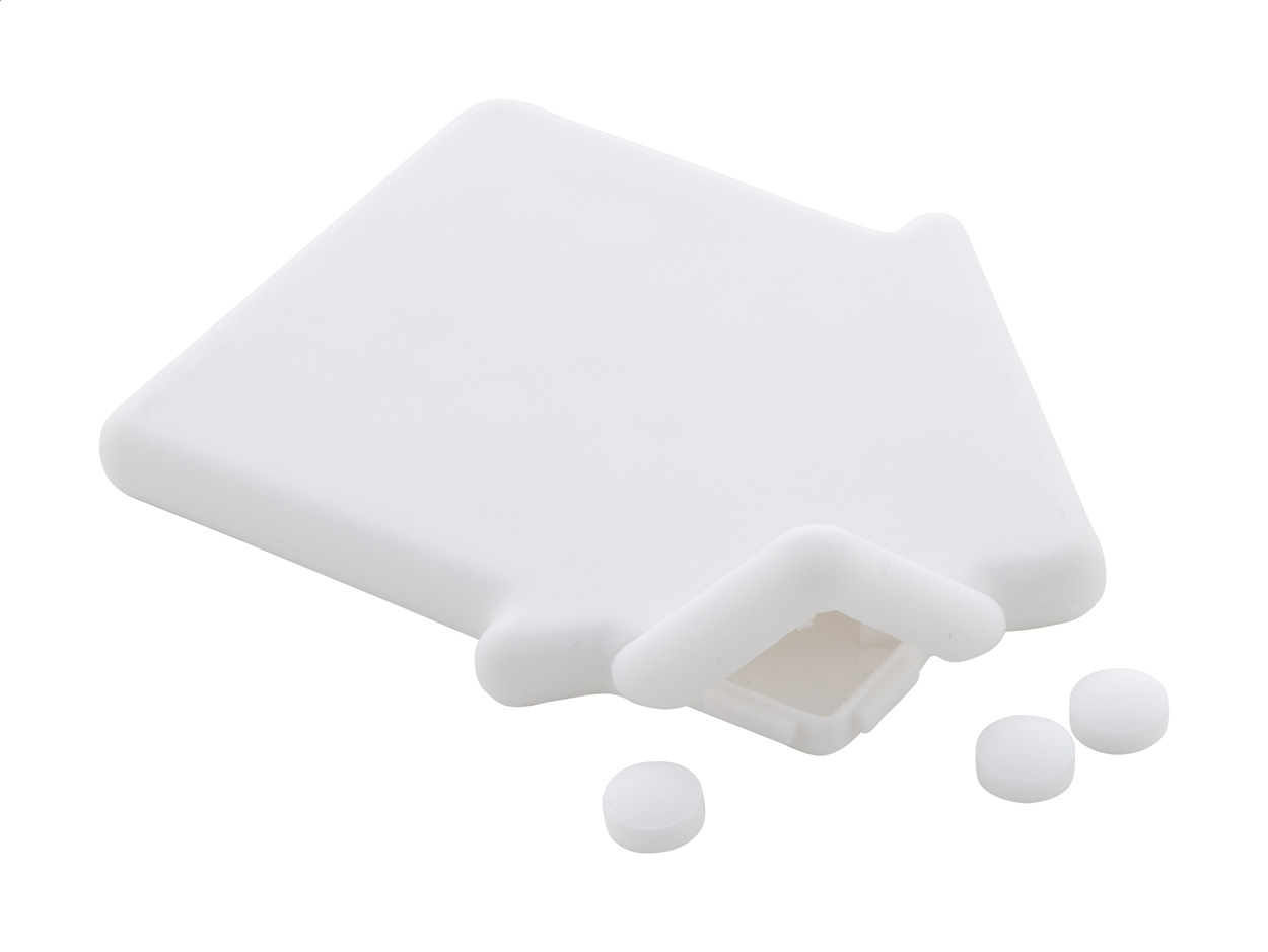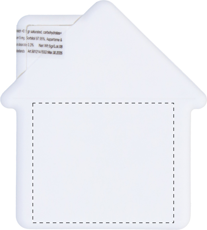 Hausförmiger Mintspender aus Kunststoff mit ca. 8 Gramm zuckerfreien Mentholbonbons.