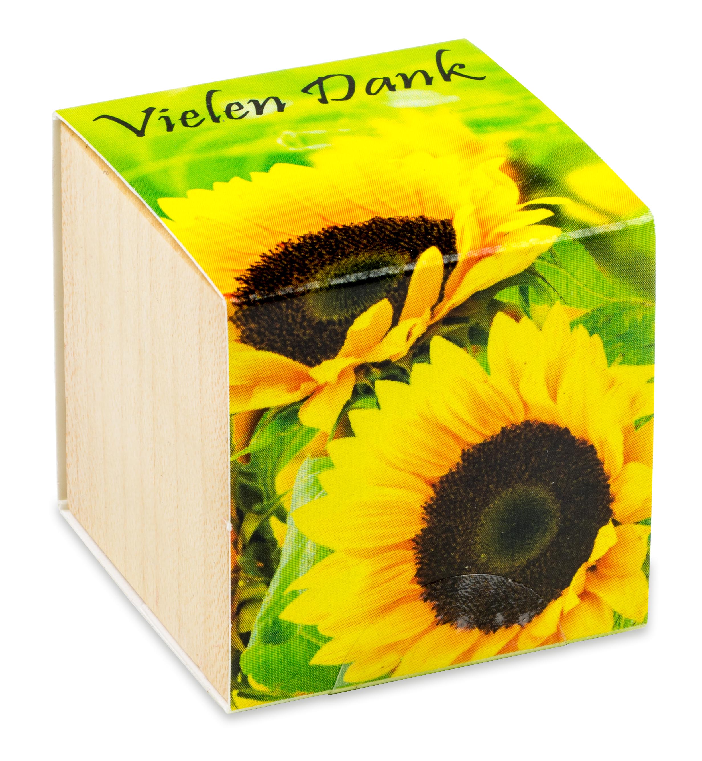 Mit sympathischer Gestaltung ab Lager in kleinen Mengen lieferbar. Keine Druckvorkosten. Der Würfel aus hellem, europäischen Holz wird mit Sonnenblumensamen und Substrattablette geliefert. Ihre Werbeanbringung wird ab 50 Stück durch eine schöne Lasergravur auf dem Holzwürfel angebracht.