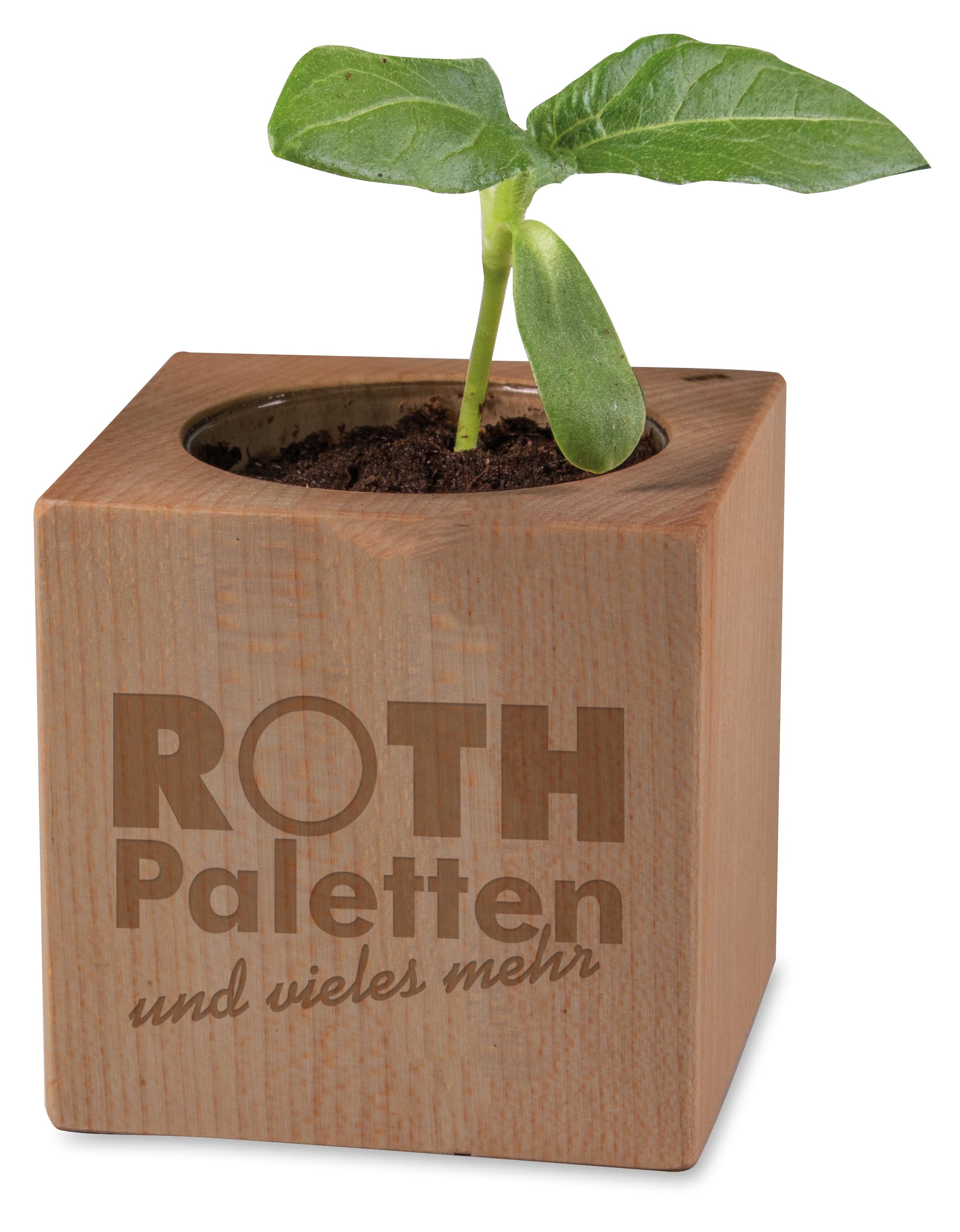 Der Würfel aus echtem Erlenholz wird mit Samen und einer Substrattablette als Erde geliefert. Ihre Werbung findet Platz auf der umliegenden Banderole und der Lasergravur auf dem Holzgefäß. Ein Stück Natur auf dem Schreibtisch oder der Fensterbank zeugt von dem grünen Fingerabdruck des werbenden Unternehmens.