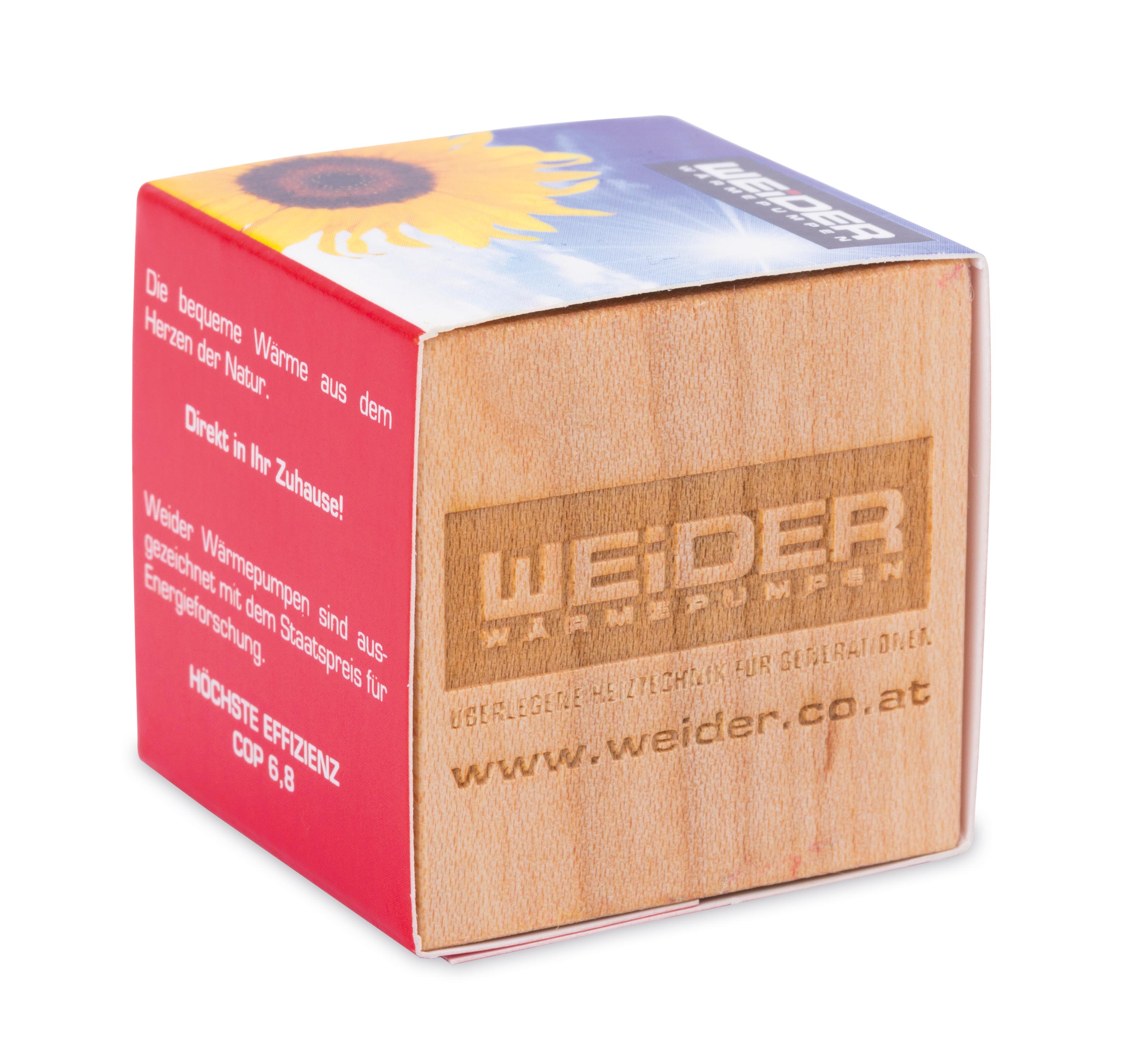 Der Würfel aus hellem europäischem Holz wird mit Samen und einer Substrattablette als Erde geliefert. Ihre Werbung findet Platz auf der umliegenden Banderole und mit der Lasergravur auf dem Holzgefäß. Ein Stück Natur auf dem Schreibtisch oder der Fensterbank zeugt von dem grünen Fingerabdruck des werbenden Unternehmens.
