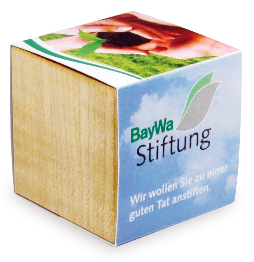 Der Würfel aus hellem europäischem Holz wird mit Samen und einer Substrattablette als Erde geliefert. Ihre Werbung findet Platz auf der umliegenden Banderole und mit der Lasergravur auf dem Holzgefäß. Ein Stück Natur auf dem Schreibtisch oder der Fensterbank zeugt von dem grünen Fingerabdruck des werbenden Unternehmens.