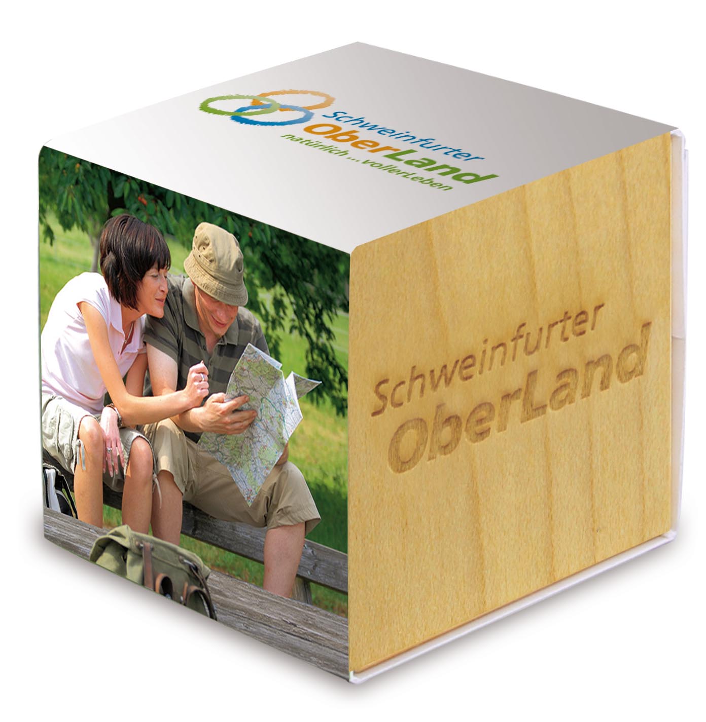 Der Würfel aus hellem europäischem Holz wird mit Samen und einer Substrattablette als Erde geliefert. Ihre Werbung findet Platz auf der umliegenden Banderole und mit der Lasergravur auf dem Holzgefäß. Ein Stück Natur auf dem Schreibtisch oder der Fensterbank zeugt von dem grünen Fingerabdruck des werbenden Unternehmens.