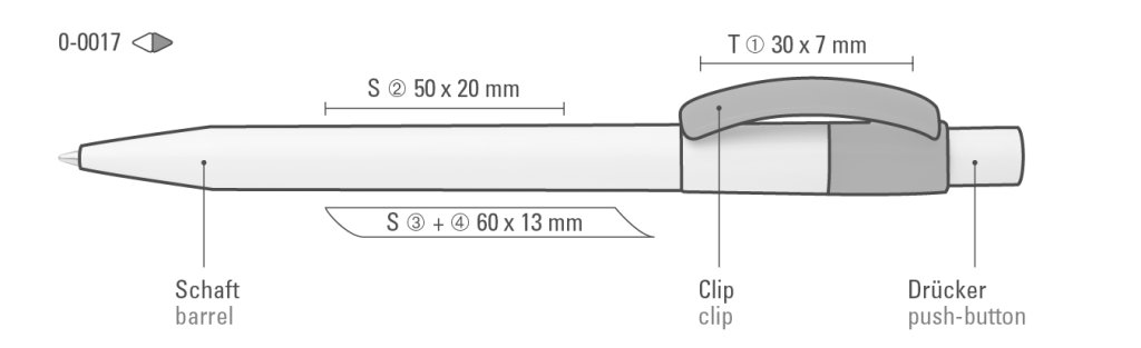 Druckbereich: Auf dem Clip 30mm x 7mm Tampondruck (T), in Clipverlängerung 50mm x 20mm Siebdruck (S), seitlich vom Clip 60mm x 13mm Siebdruck (S), gegenüber vom Clip 60mm x 13mm Siebdruck (S)