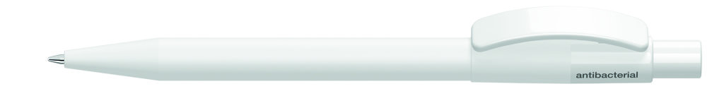 Druckkugelschreiber mit antibakteriell wirkendem Kunststoffgehäuse in weiß matt, Bogenclip und Drücker. Der nach ISO 22196:2011 geprüfte antimikrobielle Zusatz aus Silberionen verleiht dem Kunststoff eine antibakterielle Wirkung, die eine Haftung und Ansiedlung von Bakterien oder Krankheitserregern auf der Oberfläche des Schreibgerätes um 99,99% verringert. Der verarbeitete Kunststoff ist nicht nur antibakteriell, sondern auch schadstofffrei und umweltverträglich und entspricht den europäischen Lebensmittelrichtlinien, sowie der amerikanischen FDA.
