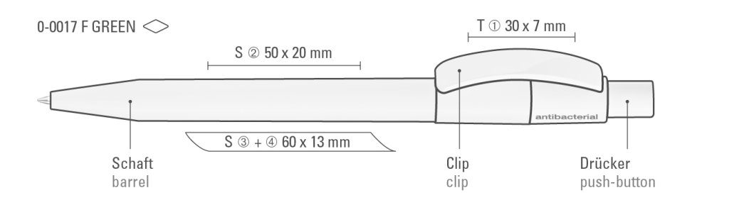 Druckbereich: In Clipverlängerung 50mm x 20mm Siebdruck (S), auf dem Clip 30mm x 7mm Tampondruck (T), seitlich vom Clip 60mm x 13mm Siebdruck (S), gegenüber vom Clip 60mm x 13mm Siebdruck (S)