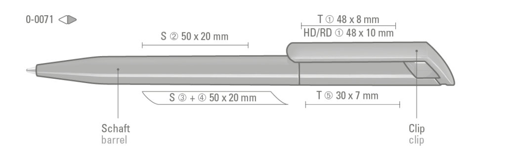 Druckbereich: Auf dem Clip 48mm x 8mm Tampondruck (T), auf der Kappe/auf dem Oberteil 30mm x 7mm Tampondruck (T), in Clipverlängerung 50mm x 20mm Siebdruck (S), seitlich vom Clip 50mm x 20mm Siebdruck (S), gegenüber vom Clip 50mm x 20mm Siebdruck (S), auf dem Clip 48mm x 10mm Digitaldruck (HD), auf dem Clip 48mm x 10mm Reliefdruck (HD)