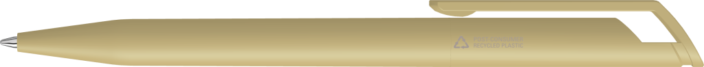 Drehkugelschreiber mit gedeckt glänzendem Gehäuse aus 100% recyceltem Post-Consumer-Kunststoff. Das Modell ist mit dem Recyclingzeichen gekennzeichnet. Aufgrund der Besonderheit des Materials (Post-Consumer Recycled Plastic) sind produktionstechnische Farbschwankungen gegeben.Druckbereich: Auf dem Clip 48mm x 8mm Tampondruck (T), auf der Kappe/auf dem Oberteil 30mm x 7mm Tampondruck (T), in Clipverlängerung 50mm x 20mm Siebdruck (S), seitlich vom Clip 50mm x 20mm Siebdruck (S), gegenüber vom Clip 50mm x 20mm Siebdruck (S), auf dem Clip 48mm x 10mm Digitaldruck (HD), auf dem Clip 48mm x 10mm Reliefdruck (HD)