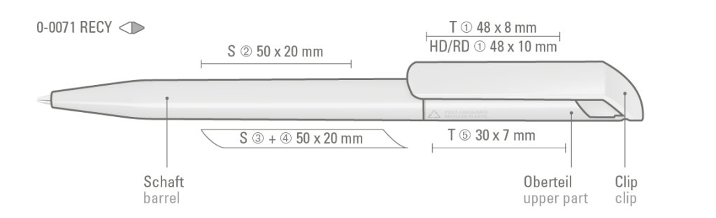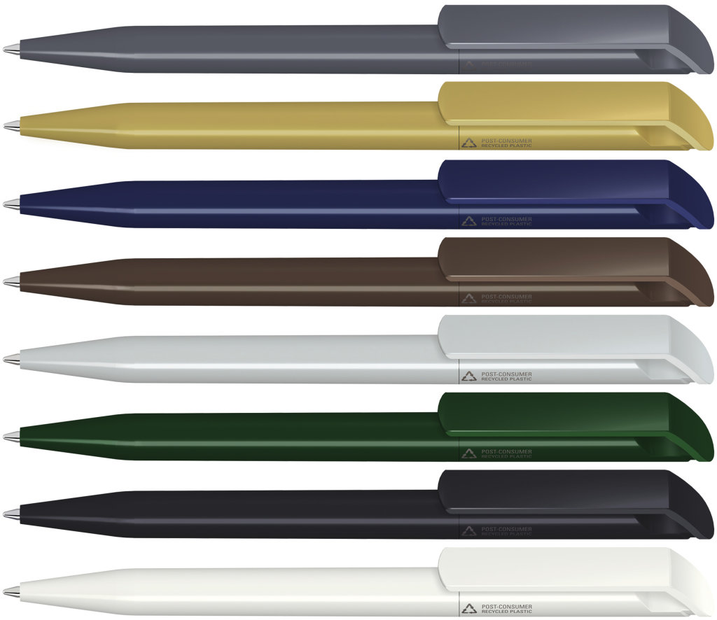 Drehkugelschreiber mit gedeckt glänzendem Gehäuse aus 100% recyceltem Post-Consumer-Kunststoff. Das Modell ist mit dem Recyclingzeichen gekennzeichnet. Aufgrund der Besonderheit des Materials (Post-Consumer Recycled Plastic) sind produktionstechnische Farbschwankungen gegeben.Druckbereich: Auf dem Clip 48mm x 8mm Tampondruck (T), auf der Kappe/auf dem Oberteil 30mm x 7mm Tampondruck (T), in Clipverlängerung 50mm x 20mm Siebdruck (S), seitlich vom Clip 50mm x 20mm Siebdruck (S), gegenüber vom Clip 50mm x 20mm Siebdruck (S), auf dem Clip 48mm x 10mm Digitaldruck (HD), auf dem Clip 48mm x 10mm Reliefdruck (HD)