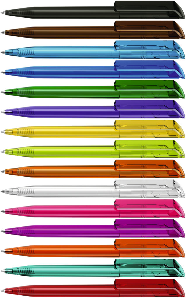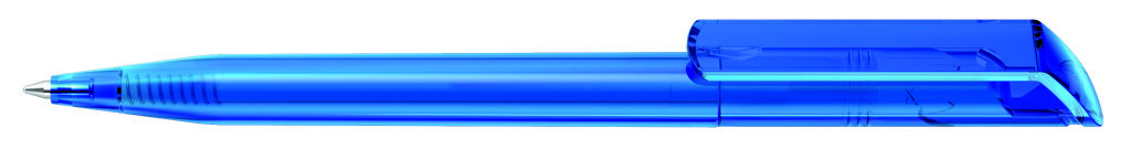 Drehkugelschreiber mit transparent glänzendem Gehäuse.Druckbereich: Auf dem Clip 48mm x 8mm Tampondruck (T), in Clipverlängerung 50mm x 20mm Siebdruck (S), gegenüber vom Clip 50mm x 20mm Siebdruck (S), seitlich vom Clip 50mm x 20mm Siebdruck (S), auf der Kappe/auf dem Oberteil 30mm x 7mm Tampondruck (T), auf dem Clip 48mm x 10mm Digitaldruck (HD), auf dem Clip 48mm x 10mm Reliefdruck (HD)