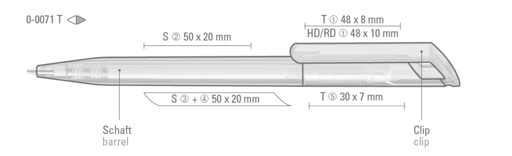 Druckbereich: Auf dem Clip 48mm x 8mm Tampondruck (T), in Clipverlängerung 50mm x 20mm Siebdruck (S), gegenüber vom Clip 50mm x 20mm Siebdruck (S), seitlich vom Clip 50mm x 20mm Siebdruck (S), auf der Kappe/auf dem Oberteil 30mm x 7mm Tampondruck (T), auf dem Clip 48mm x 10mm Digitaldruck (HD), auf dem Clip 48mm x 10mm Reliefdruck (HD)