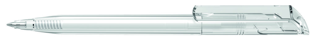 Drehkugelschreiber mit transparent glänzendem Gehäuse.Druckbereich: Auf dem Clip 48mm x 8mm Tampondruck (T), in Clipverlängerung 50mm x 20mm Siebdruck (S), gegenüber vom Clip 50mm x 20mm Siebdruck (S), seitlich vom Clip 50mm x 20mm Siebdruck (S), auf der Kappe/auf dem Oberteil 30mm x 7mm Tampondruck (T), auf dem Clip 48mm x 10mm Digitaldruck (HD), auf dem Clip 48mm x 10mm Reliefdruck (HD)