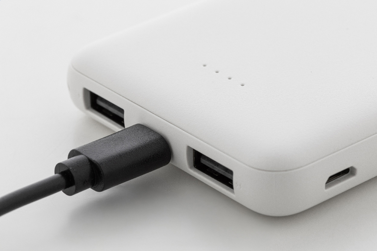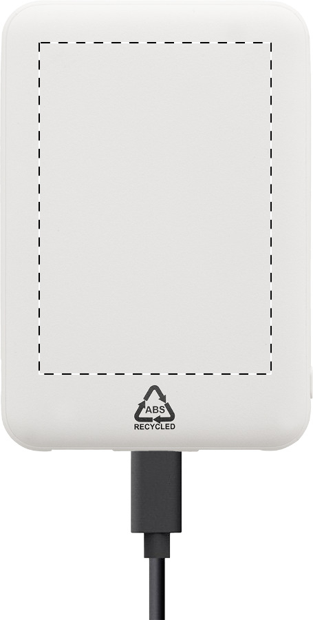 Powerbank aus recyceltem ABS mit 5000 mAh Akku. Mit zwei USB- und einem USB-C-Ladeanschluss. Micro-USB- und USB-C-Eingang. Inklusive USB-Ladekabel.