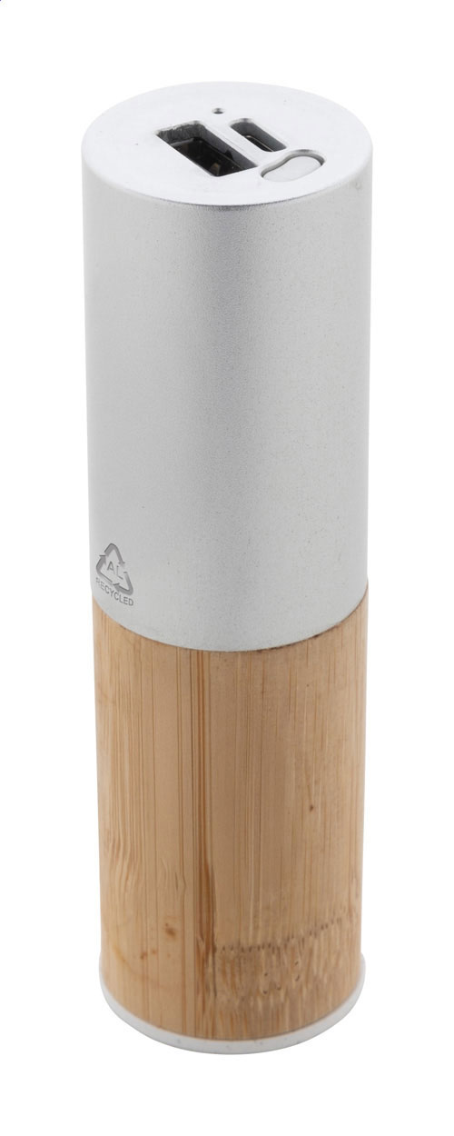 Powerbank aus recyceltem Aluminium und Bambus mit 2600-mAh-Akku. Mit 1 USB- und 1 USB-C-Ladeanschluss. USB-C-Eingangsanschluss. Inkl. USB-Ladekabel.