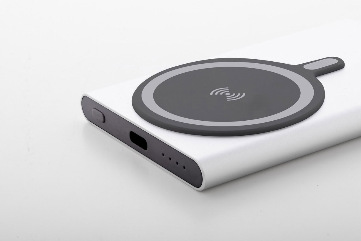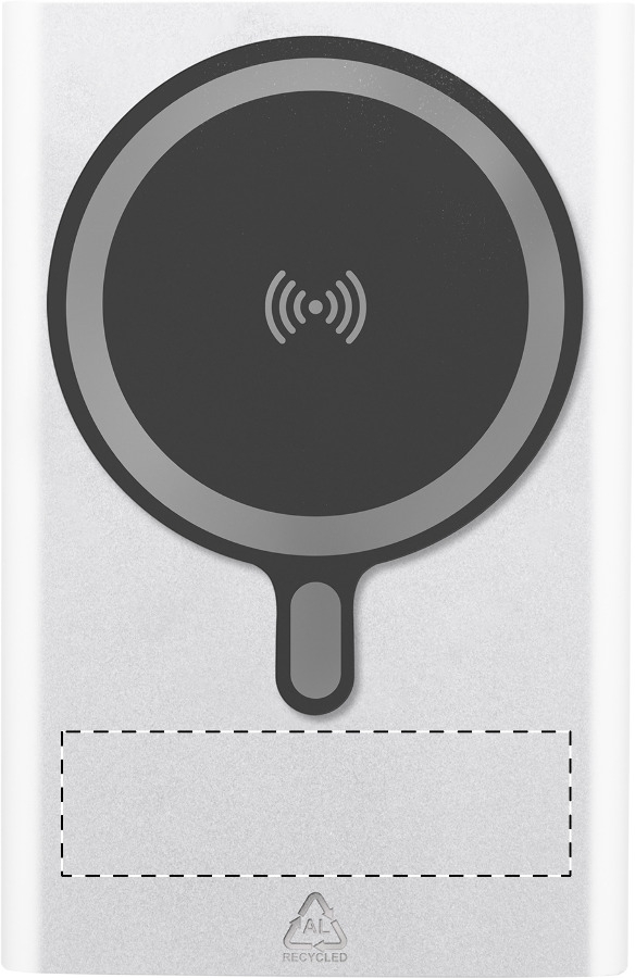 Powerbank aus recyceltem Aluminium mit eingebautem magnetischem Wireless-Charger (15 W) und 5000 mAh Akku. Mit USB-C-Eingang und Ladebuchse. Inklusive selbstklebendem Metallring zur Nutzung der Magnetfunktion auf jedem kabellos aufladbaren Gerät. Kompatibel mit iPhone® 12 oder neuer. Inklusive USB-Ladekabel.