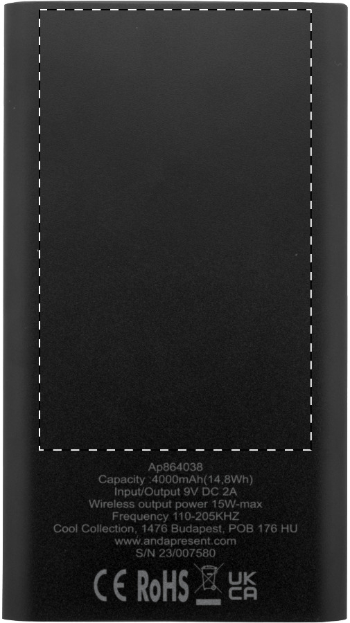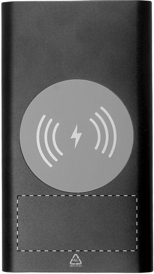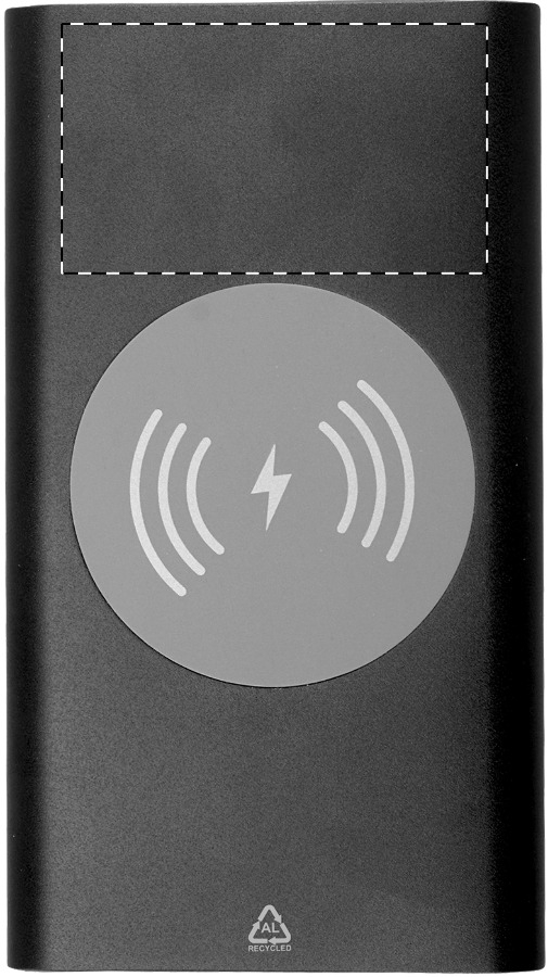 USB Powerbank aus recyceltem Aluminium mit eingebautem Wireless-Fastcharger (15W), 4000 mAh Akku, 1 USB und 1 USB-C Ladeports und USB-C Eingangsport. Inkl. USB-Ladekabel.