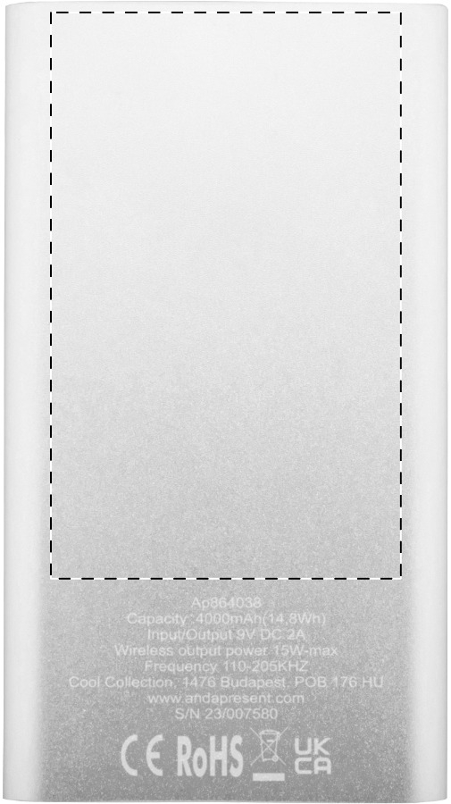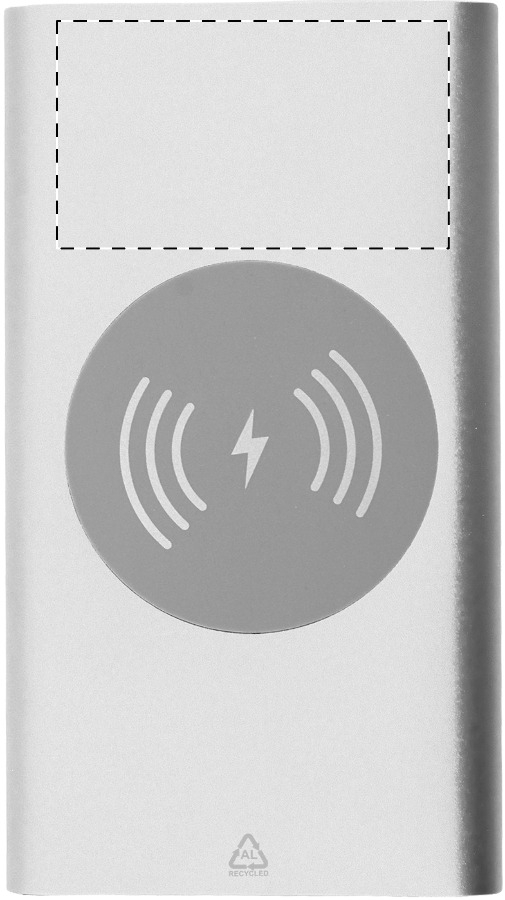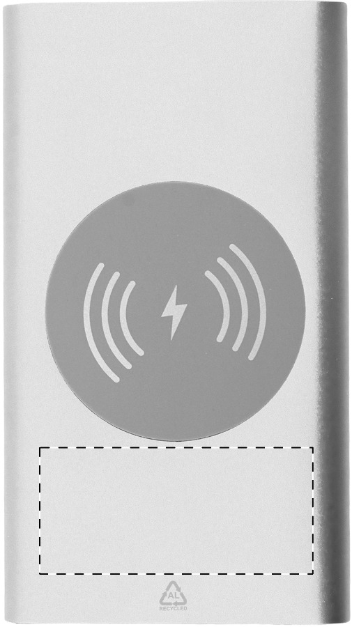 USB Powerbank aus recyceltem Aluminium mit eingebautem Wireless-Fastcharger (15W), 4000 mAh Akku, 1 USB und 1 USB-C Ladeports und USB-C Eingangsport. Inkl. USB-Ladekabel.