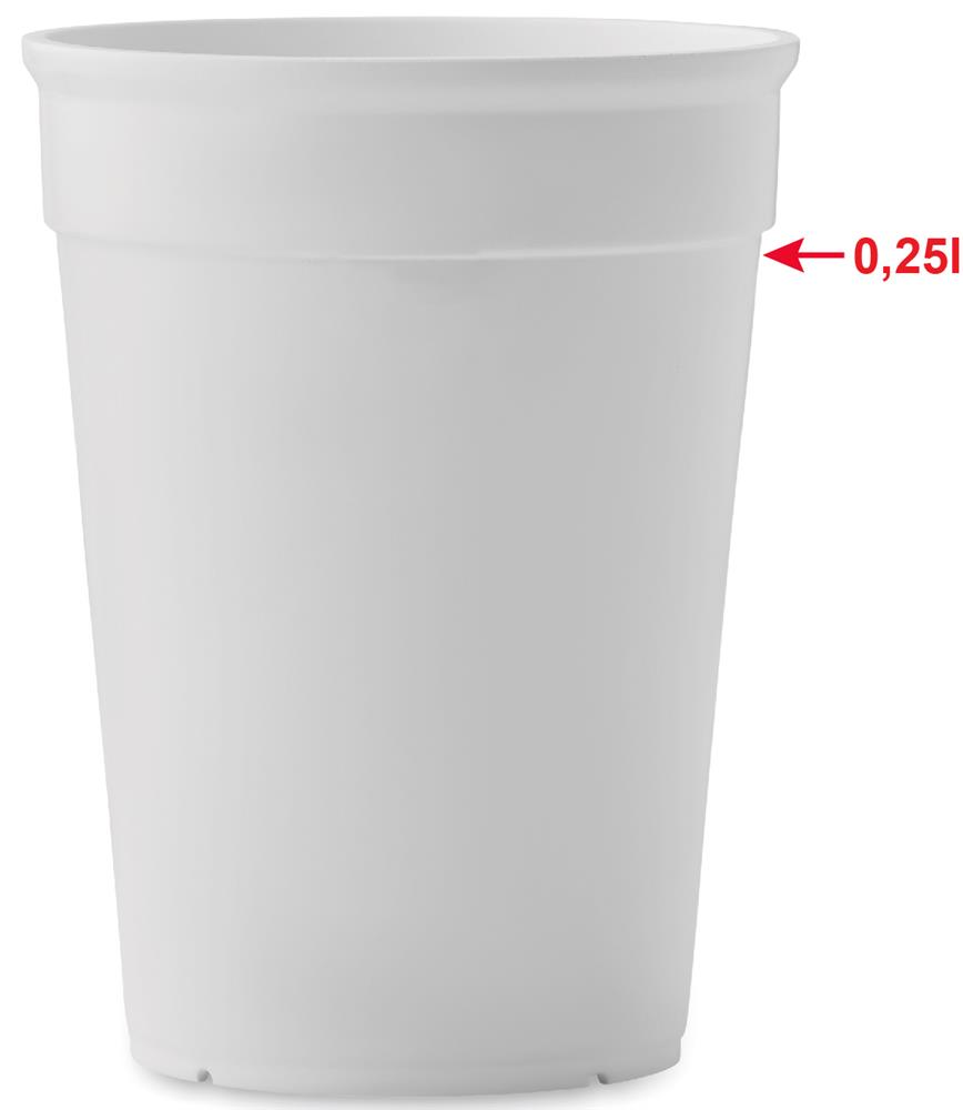 Einwandiger Becher aus PP. Füllmenge: 250 ml. Da der einwandige Becher die Hitze nach außen leiten kann, kann der Artikel heiß werden.Material: PPMaße: Ø8.5x10cmGewicht: 0.028 kgVeredelung: Bestickung, Bedruckung, BeflockungHandling/Farbcodes: Z/03, 06, 13, 85Druckposition: ROUNDSCREENDruckmaße: 130 x 40 mmDrucktechniken: RS3Druckposition: FRONTDruckmaße: 30 x 35 mmDrucktechniken: P4Druckposition: BACKDruckmaße: 30 x 35 mmDrucktechniken: P4