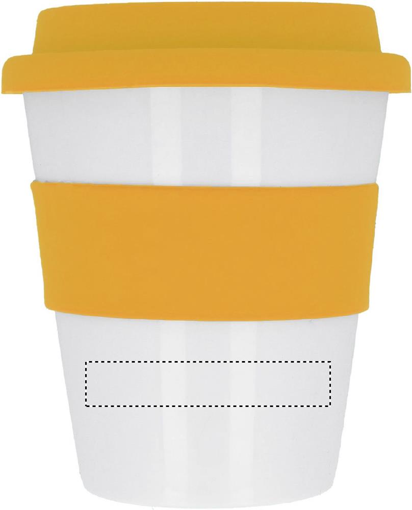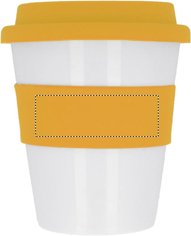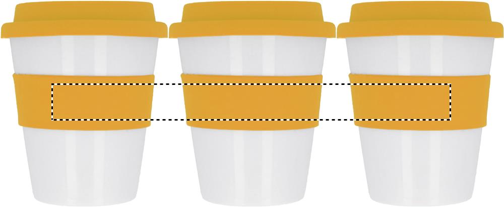 Einwandiger Becher aus glänzend weißem PP mit Silikon-Deckel und -Griff. Füllmenge: 350 ml. Da der einwandige Becher die Hitze nach außen leiten kann, kann der Artikel heiß werden.Material: PPMaße: Ø8,5x11 cmGewicht: 0.086 kgVeredelung: Bestickung, Bedruckung, BeflockungHandling/Farbcodes: B/03, 04, 05, 09, 10, 06, 12, 07Druckposition: ROUNDSCREENDruckmaße: 55 x 10 mmDrucktechniken: RS5Druckposition: RIBBONDruckmaße: 60 x 20 mmDrucktechniken: S4Druckposition: MUG FRONT UPPERDruckmaße: 30 x 15 mmDrucktechniken: P5Druckposition: MUG FRONT LOWERDruckmaße: 30 x 30 mmDrucktechniken: P5Druckposition: ROUNDSCREEN RIBBONDruckmaße: 220 x 20 mmDrucktechniken: RS3