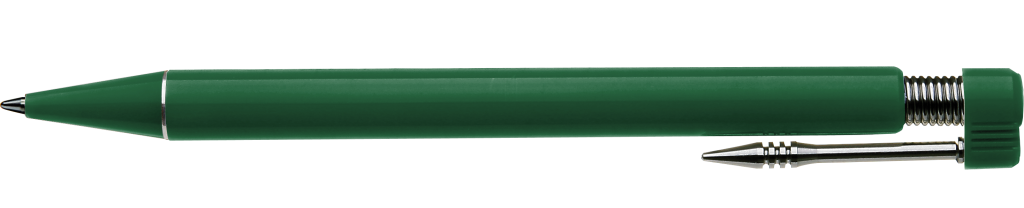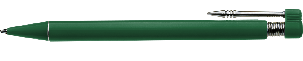 Druckkugelschreiber mit beweglichem Drückerkopf und vernickelter Metallfeder. Vernickelter Metallnadelclip und Zierring.