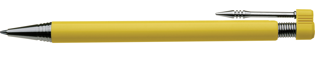 Druckkugelschreiber mit beweglichem Drückerkopf auf vernickelter Metallfeder. Vernickelter Metallnadelclip und schwere Metallspitze.