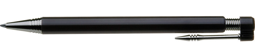 Druckkugelschreiber mit beweglichem Drückerkopf auf vernickelter Metallfeder. Vernickelter Metallnadelclip und schwere Metallspitze.Druckbereich: In Clipverlängerung 50mm x 16mm Siebdruck (S), gegenüber vom Clip 65mm x 13mm Siebdruck (S), seitlich vom Clip 65mm x 13mm Siebdruck (S)