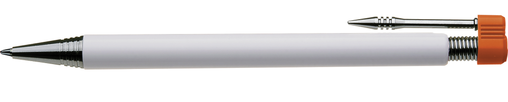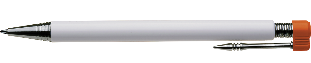 Druckkugelschreiber mit beweglichem Drückerkopf auf vernickelter Metallfeder. Vernickelter Metallnadelclip und schwere Metallspitze.