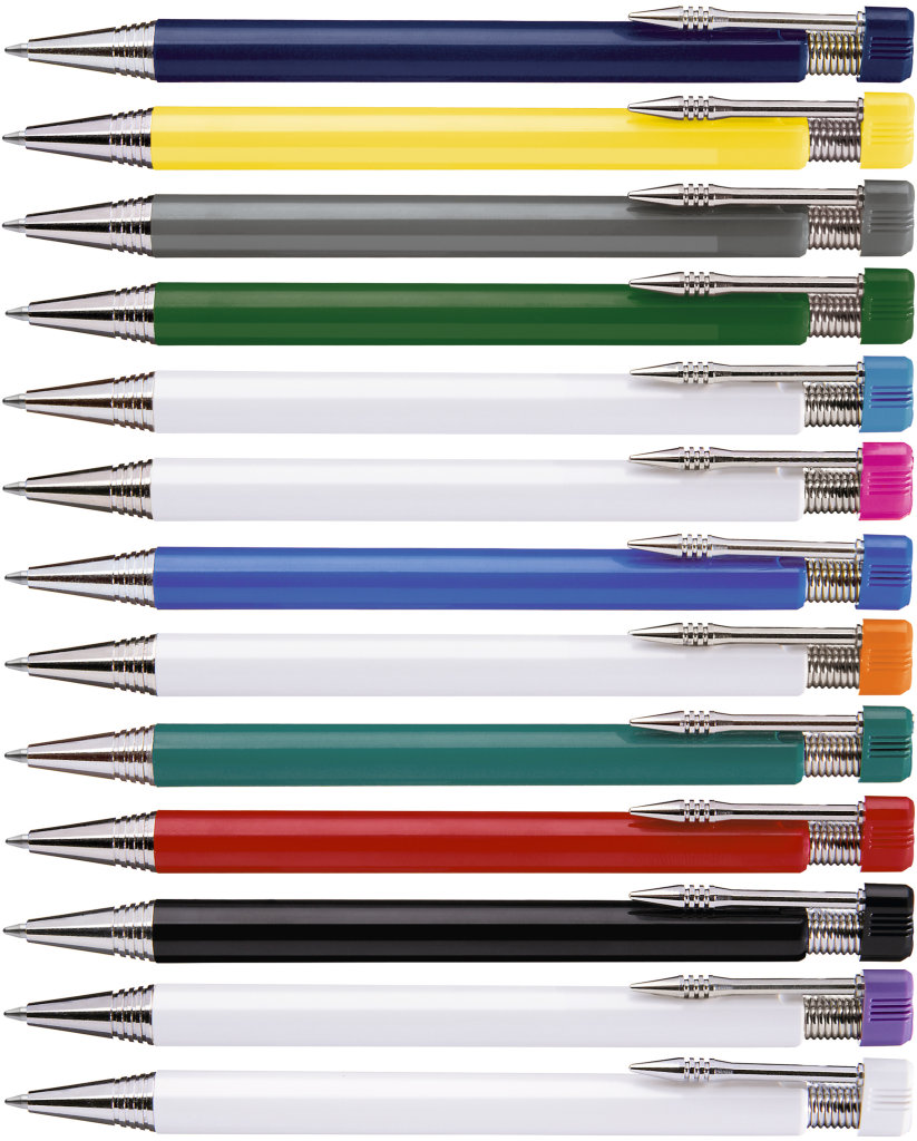 Farbiger Kugelschreiber aus Kunststoff, schwarzschreibend.Maße: ø10×138 mmSchreibgerät-Typ: KugelschreiberSchreibgerät-Mechanik: DruckmechanikSchreibfarbe: SchwarzMinentyp: Normale MineLinienstärke: 1 mmMaterial: KunststoffVeredelungsposition 1: Korpus - rechts vom ClipTechnologie: TampondruckMaximale Farben: 4Durchmesser: 0Druckcode: P0Technologie: TampondruckMaximale Farben: 1Durchmesser: 0Druckcode: P1Technologie: UV LED DruckDurchmesser: 0Druckcode: UVAVeredelungsposition 2: Korpus - links vom ClipTechnologie: TampondruckMaximale Farben: 4Durchmesser: 0Druckcode: P0Technologie: TampondruckMaximale Farben: 1Durchmesser: 0Druckcode: P1Technologie: UV LED DruckDurchmesser: 0Druckcode: UVAVeredelungsposition 3: KlipTechnologie: TampondruckMaximale Farben: 4Durchmesser: 0Druckcode: P0Veredelungsposition 4: Korpus - in Verlängerung vom ClipTechnologie: TampondruckMaximale Farben: 4Durchmesser: 0Druckcode: P0