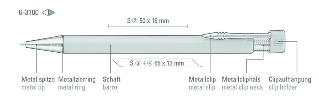 Weißer Kunststoff-Kugelschreiber mit farbigem Clip, blauschreibend.Maße: ø10×138 mmSchreibgerät-Typ: KugelschreiberSchreibgerät-Mechanik: DruckmechanikSchreibfarbe: BlauMinentyp: Normale MineLinienstärke: 1 mmMaterial: Kunststoff (ABS)Veredelungsposition 1: Korpus - rechts vom ClipTechnologie: UV-LED-Druck - EinzelnamenDurchmesser: 0Druckcode: NUVATechnologie: TampondruckMaximale Farben: 4Durchmesser: 0Druckcode: P0Technologie: TampondruckMaximale Farben: 1Durchmesser: 0Druckcode: P1Technologie: UV LED DruckDurchmesser: 0Druckcode: UVAVeredelungsposition 2: Korpus - links vom ClipTechnologie: UV-LED-Druck - EinzelnamenDurchmesser: 0Druckcode: NUVATechnologie: TampondruckMaximale Farben: 4Durchmesser: 0Druckcode: P0Technologie: TampondruckMaximale Farben: 1Durchmesser: 0Druckcode: P1Technologie: UV LED DruckDurchmesser: 0Druckcode: UVAVeredelungsposition 3: KlipTechnologie: TampondruckMaximale Farben: 4Durchmesser: 0Druckcode: P0Veredelungsposition 4: Korpus - in Verlängerung vom ClipTechnologie: TampondruckMaximale Farben: 4Durchmesser: 0Druckcode: P0