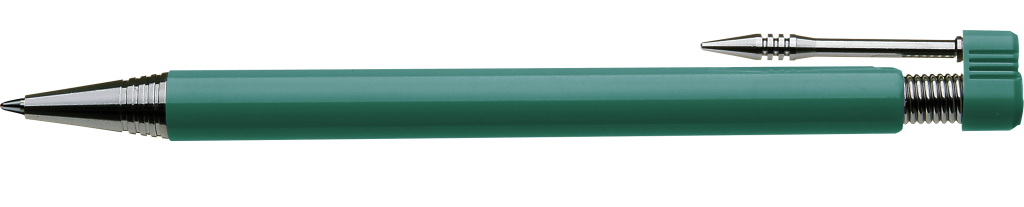 Druckkugelschreiber mit beweglichem Drückerkopf auf vernickelter Metallfeder. Vernickelter Metallnadelclip und schwere Metallspitze.
