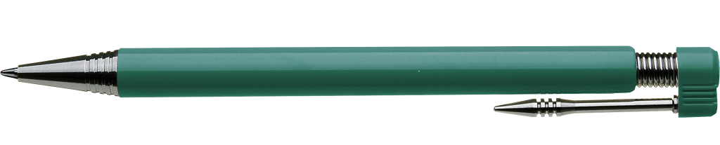 Druckkugelschreiber mit beweglichem Drückerkopf auf vernickelter Metallfeder. Vernickelter Metallnadelclip und schwere Metallspitze.Druckbereich: In Clipverlängerung 50mm x 16mm Siebdruck (S), gegenüber vom Clip 65mm x 13mm Siebdruck (S), seitlich vom Clip 65mm x 13mm Siebdruck (S)