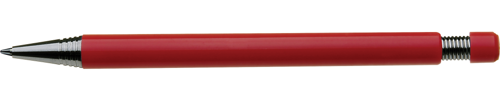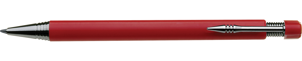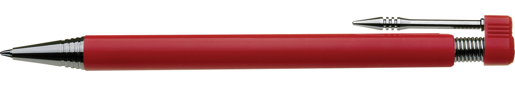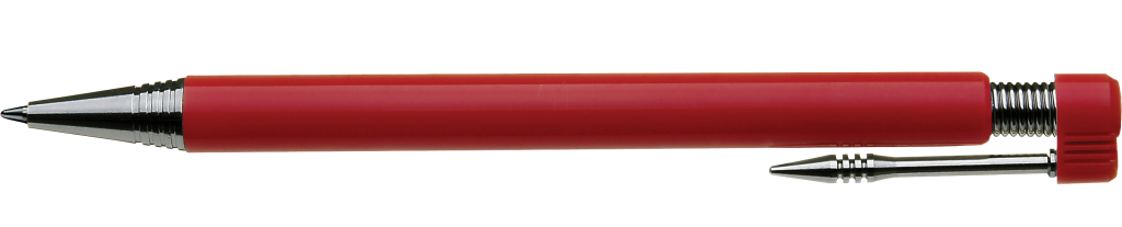 Druckkugelschreiber mit beweglichem Drückerkopf auf vernickelter Metallfeder. Vernickelter Metallnadelclip und schwere Metallspitze.