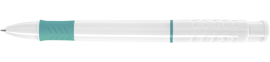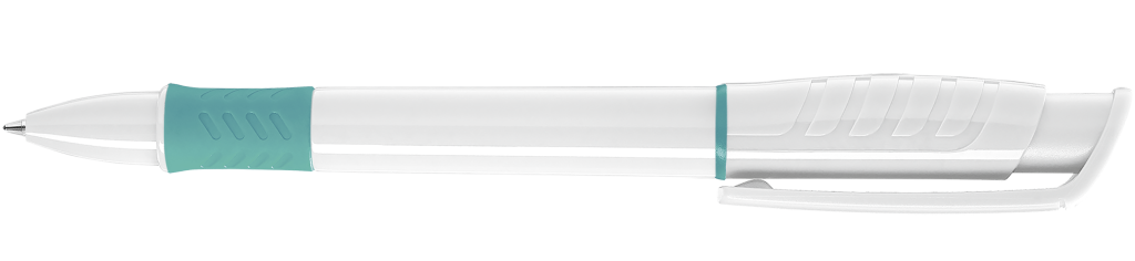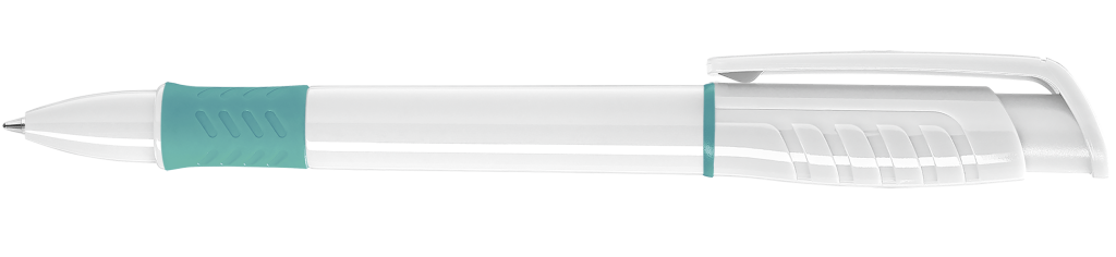 Druckkugelschreiber mit gedeckt glänzendem Gehäuse in weiß, Griffzone und Zierring farbig oder unifarben gedeckt glänzend schwarz.Druckbereich: In Clipverlängerung 30mm x 20mm Siebdruck (S), seitlich vom Clip 30mm x 20mm Siebdruck (S), gegenüber vom Clip 30mm x 20mm Siebdruck (S), auf dem Clip 35mm x 8mm Tampondruck (T)