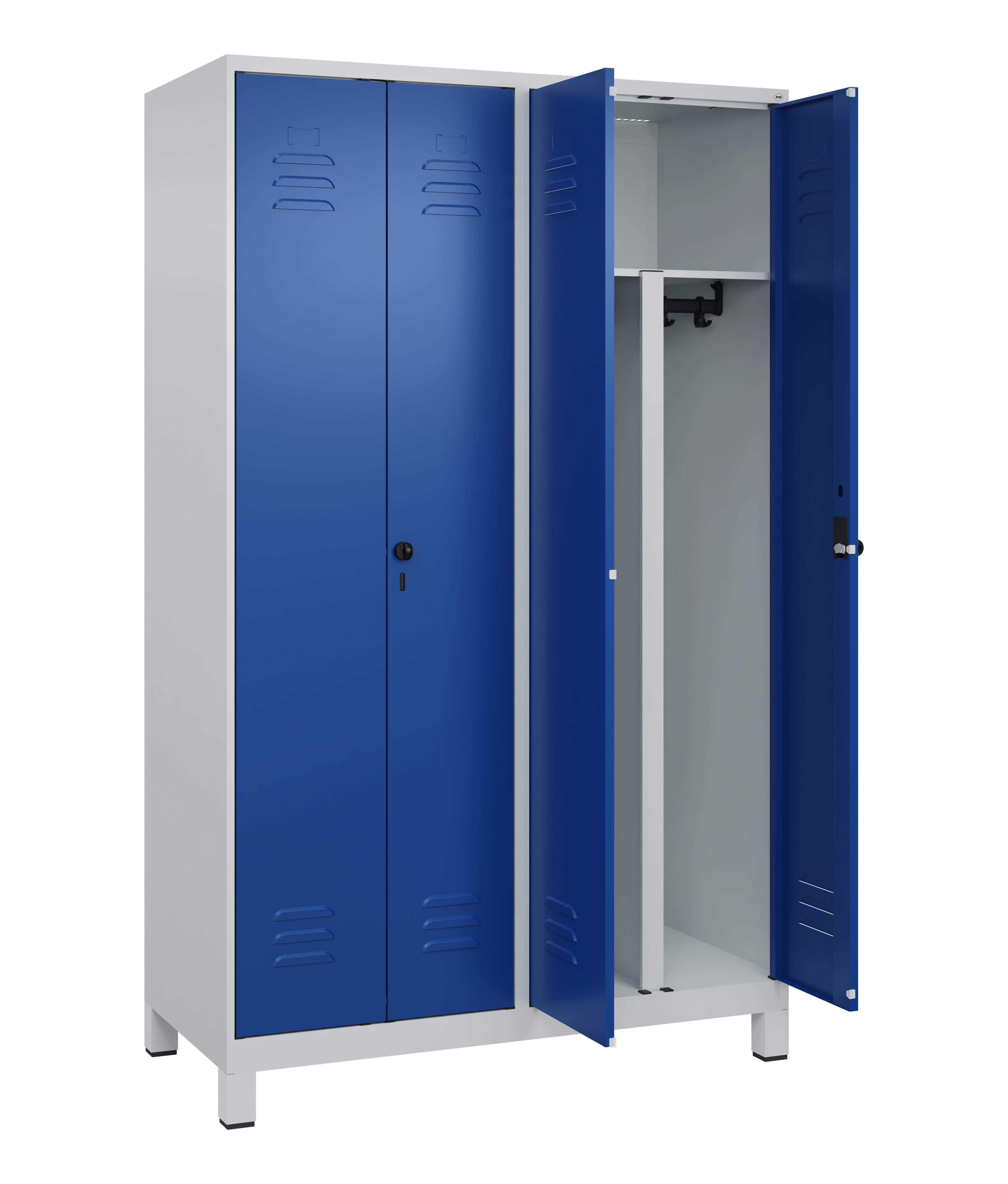 PSA Doppel-Spind Classic Plus, Füße, 4 Abteile, 1950x1200x500mm RAL 5010 Enzianblau RAL 7035 Lichtgrau
