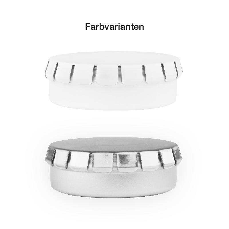 Runde Dose mit Springdeckel, silber aus Metall, individuell bedruckt. Mit Originalitätsverschluss und Aufreißperforation, Weißblech 98% recycelbar. Inhalt: American Style Jelly Beans, 22 g. Produktionsbedingt leichte Sprühnebelspuren am Motivrand möglich