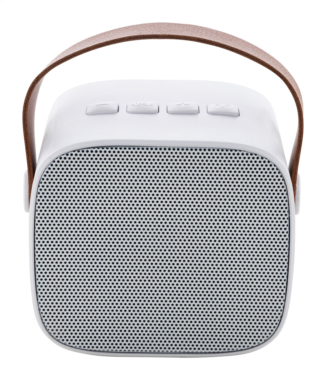 Kabelloser Lautsprecher aus recyceltem ABS mit PU-Leder-Trageriemen und eingebautem Akku (1200 mAh). Inklusive USB-Ladekabel.