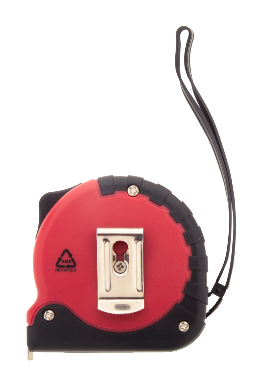 Maßband aus recyceltem ABS Kunststoff mit Stopper, Metallklip und Handschlaufe. Länge: 5 m.