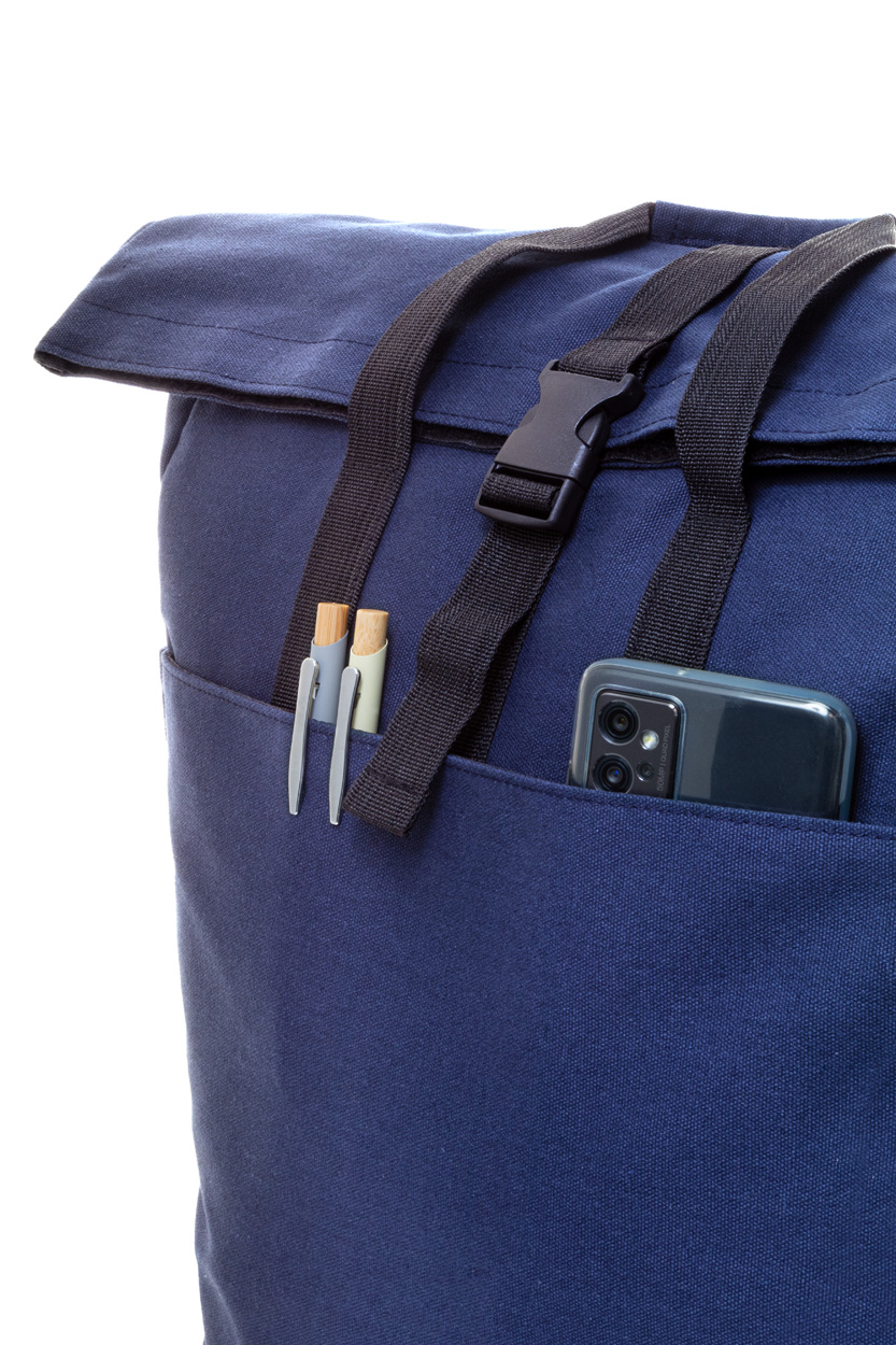 Rolltop-Rucksack aus recycelten Canvas mit Schnalle und Klettverschluss, gepolstertem Laptopfach (15"), Vorder- und Seitentaschen. Mit Trolley-Gurt, gepolstertem Rücken und Schultergurten. 70 % recycelter Baumwolle und 30 % RPET-Polyester. Mit Label recycelte Baumwolle.