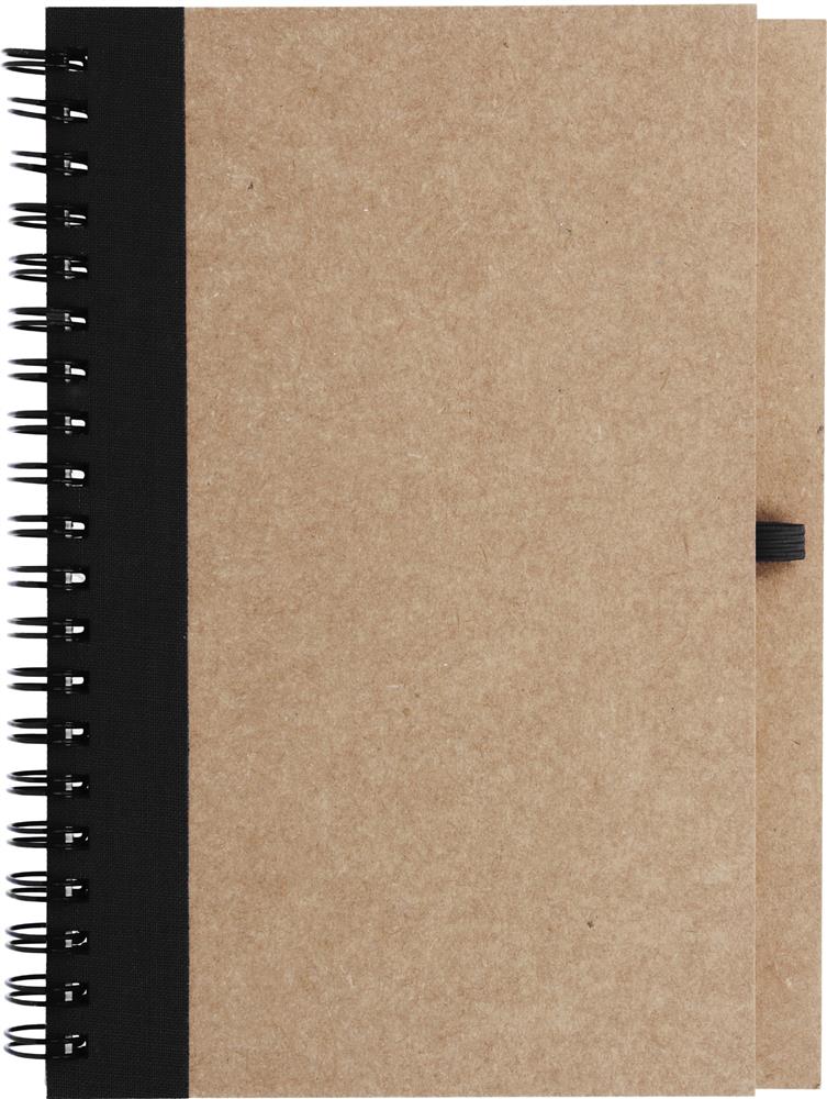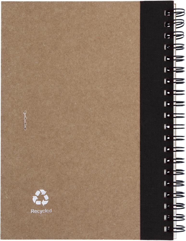 Notizbuch mit 70 Blatt (140 Seiten) recyceltem Blankopapier. Spiralbindung. Druckkugelschreiber aus recyceltem Karton mit Clip, Spitze und Drücker aus natürlich abbaubaren Kunststoff. Stiftschlaufe. Blaue Tinte.