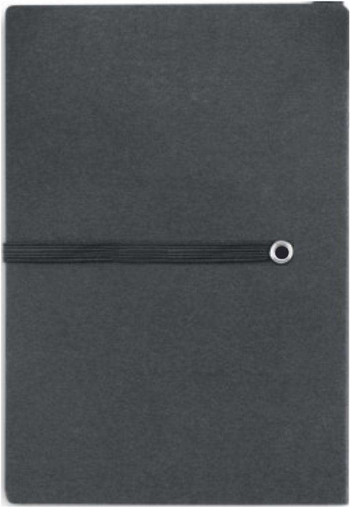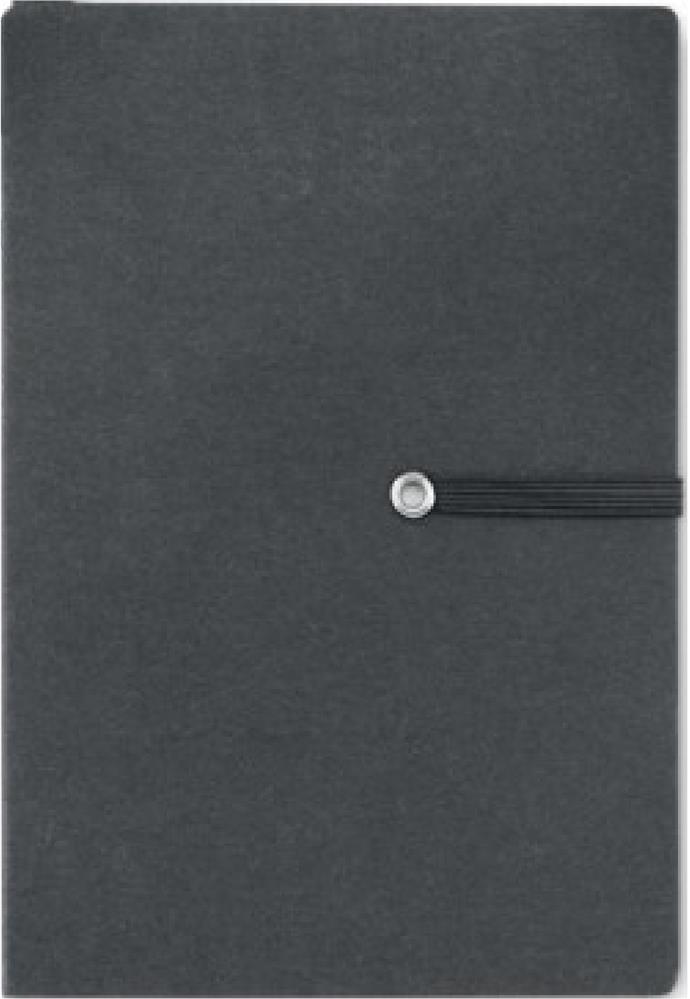 Notizbuch mit gebundenem Soft Cover aus recyceltem Karton. 70 Blatt (140 Seiten) liniertes Recyclingpapier. 2 Haftnotizblöcke und 4 farbige Markerblöcke. Elastikbandverschluss. Druckkugelschreiber aus recyceltem Karton und Details aus ABS. Schwarze Tinte.