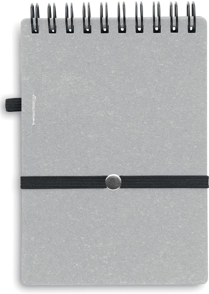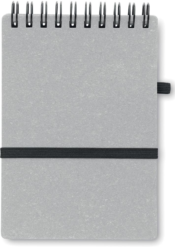 Notizbuch mit Cover aus Recyclingpapier und PU (70% Recyclingpapier, 30% PU). Spiralbindung. 70 Blatt (140 Seiten) liniertes Recyclingpapier. Elastisches Verschlussband und Stiftschlaufe. Inkl. Druckkugelschreiber aus Recyclingpapier/ABS. Blaue Tinte.
